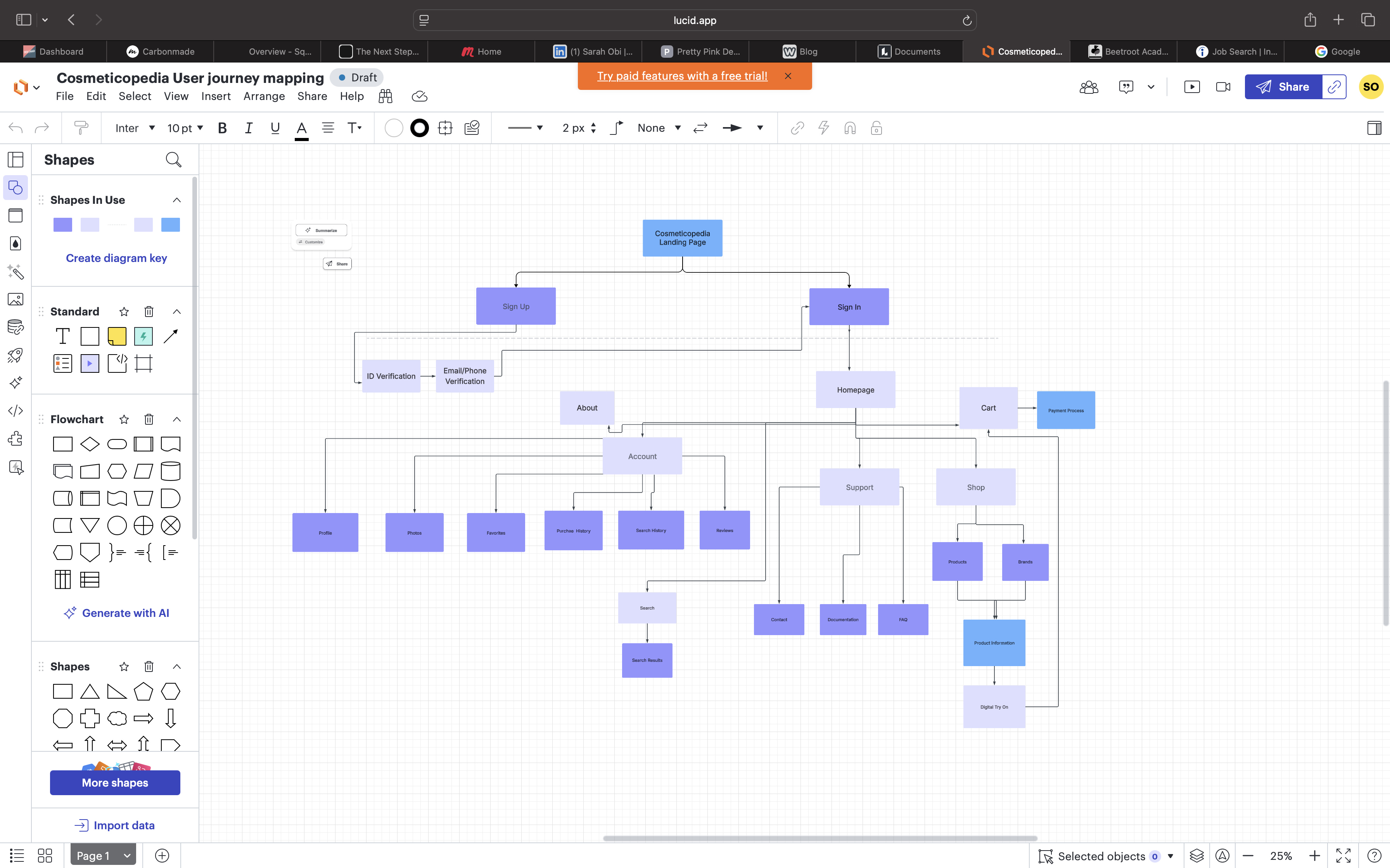 After completing the user personas, I started creating a sitemap for Cosmeticopedia. First, I used an AI sitemap generator called Octopus.io to create a rough draft of the sitemap before building it on my own using Lucid. Please view the final sitemap here.